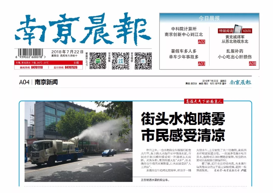 據(jù)了解,近日南京持續(xù)高溫,大水炮車每天在南京的主干道上穿梭噴霧,起到一些降溫效果。