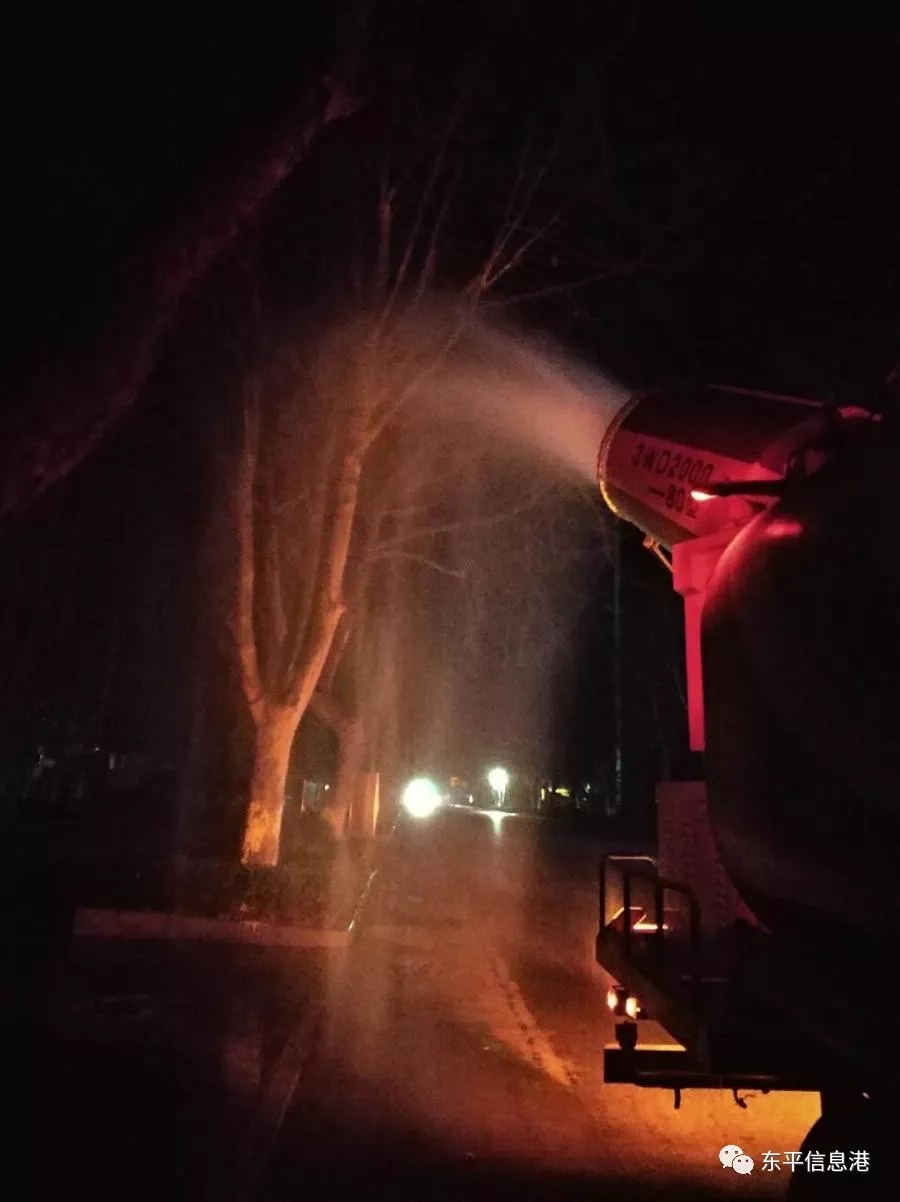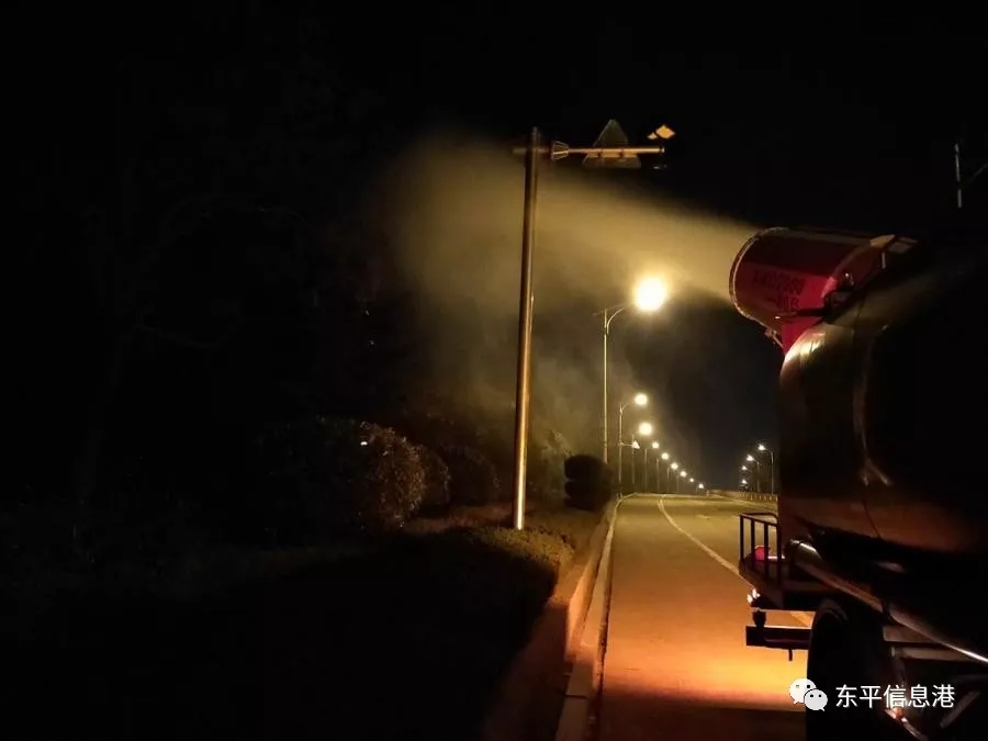 晚上10時許,東平的道路上早已沒有了白日的喧嘩,暮色中穿行的車流早已瞄準(zhǔn)了家的方向。而此時,正是園林霧炮車工作的開始……