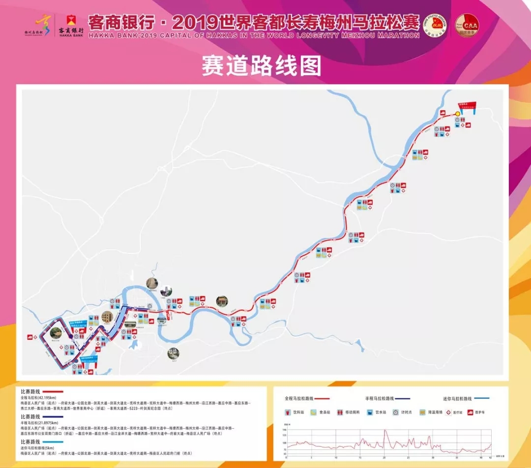 今年梅馬沿用去年經(jīng)典路線,起點(diǎn)為梅縣區(qū)人民廣場(chǎng),選手將沿梅江兩岸奔跑,途經(jīng)劍英體育館、世界客商中心、國(guó)際慢城雁洋鎮(zhèn)等梅州地標(biāo)建筑,盡覽世界客都風(fēng)情。全程馬拉松終點(diǎn)設(shè)在葉劍英紀(jì)念園,半程馬拉松終點(diǎn)設(shè)在梅縣區(qū)人民廣場(chǎng),迷你馬拉松終點(diǎn)設(shè)在梅縣區(qū)人民政府門(mén)前。