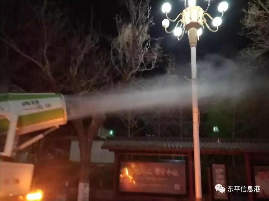 晚上10時許,東平的道路上早已沒有了白日的喧嘩,暮色中穿行的車流早已瞄準(zhǔn)了家的方向。而此時,正是園林霧炮車工作的開始……